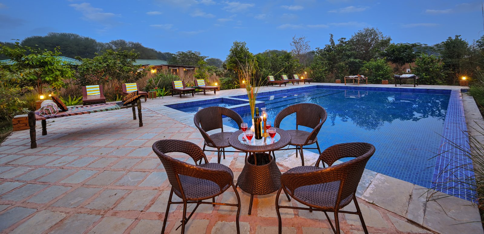 The resort offers farm-to-table dining with fresh, organic ingredients, including local Rajasthani dishes and Western cuisines.