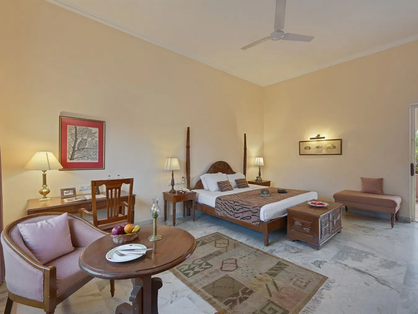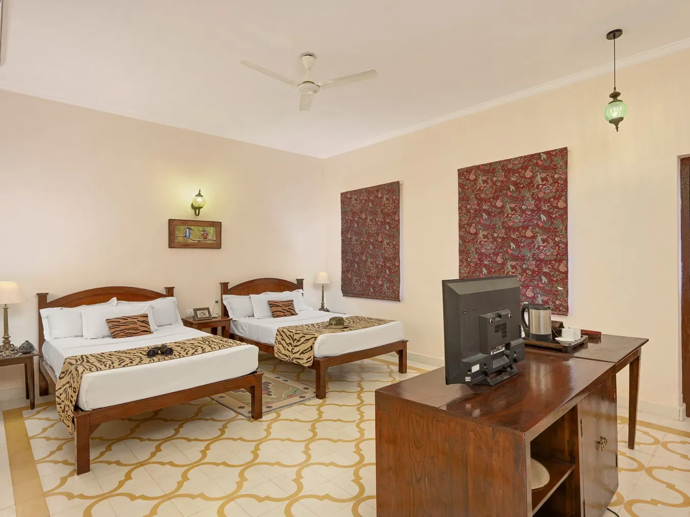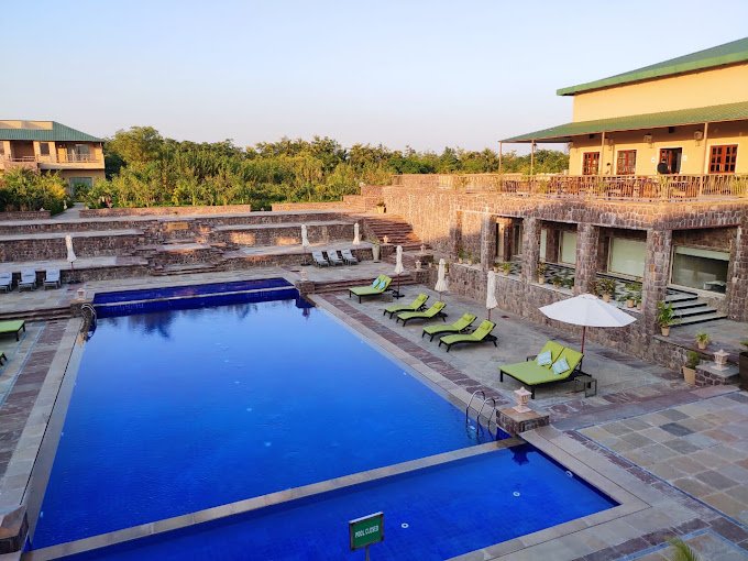 For a more luxurious experience, the Pool Side Suites offer a touch of elegance. Each suite spans 350 sq. ft. and is decorated with wildlife-inspired designs, including tiger-printed duvets and warm, earthy tones. These suites are perfect for families, with space for up to two adults and two children. The poolside location adds to the charm, offering a serene environment for relaxation.
