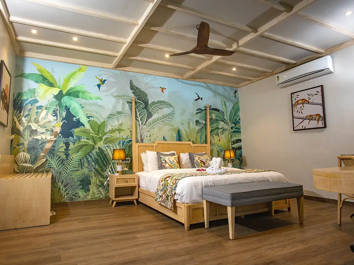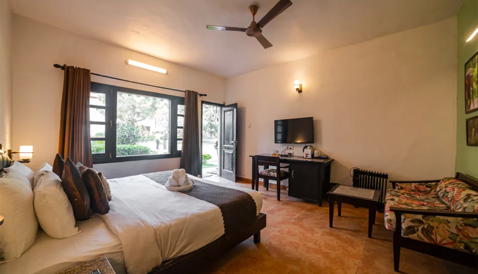 Size: 330 Sqft | Max. Occupancy: 2 guests. These cottages provide a cozy retreat with a private area and stunning landscape views. The Luxury Cottages combine comfort and style, perfect for a peaceful, luxurious stay in Corbett’s beauty.