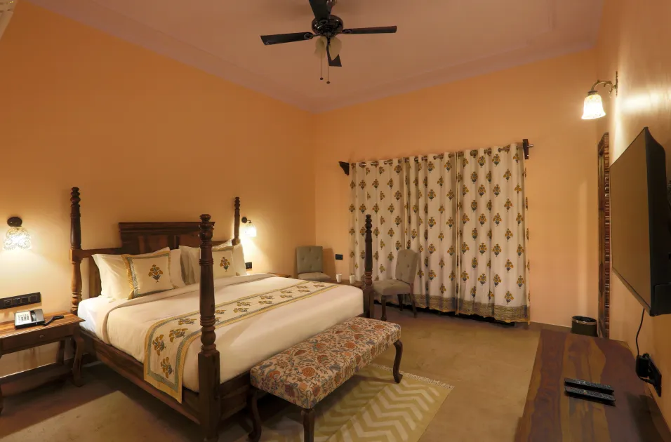 Experience rustic luxury in the Sariska Room. From your window, enjoy stunning sunrises and starry nights. The nearby river adds soothing sounds for a peaceful stay. This room fits 4 people.