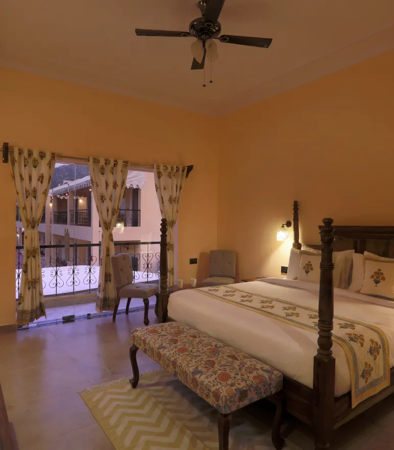 The Sariska Room W/O Balcony is a private retreat in nature. Wake up to fresh air and greenery. It fits four and has views of the eucalyptus forest. It’s perfect for families or friends.