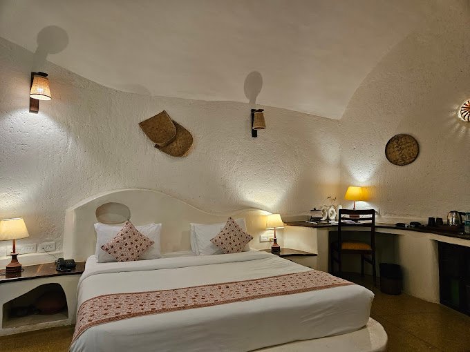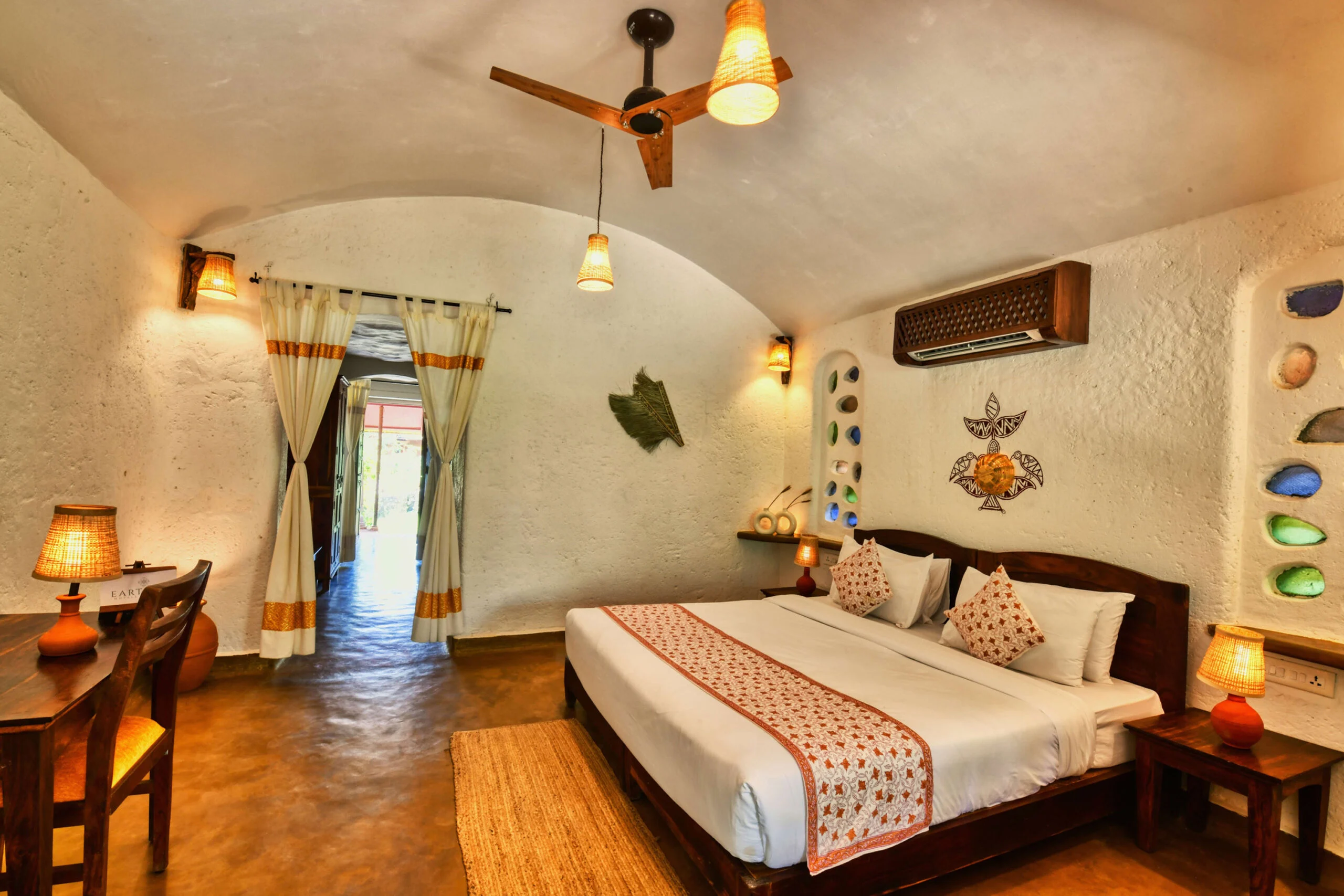 4. Tejas – The Spacious Mud Cottage Tejas features a king-size bed and an open-to-sky shower in a large 750-square-foot mud cottage. The earthy interiors and personal sit-out create a calming environment. This eco-friendly space is perfect for families or couples looking for a peaceful escape.