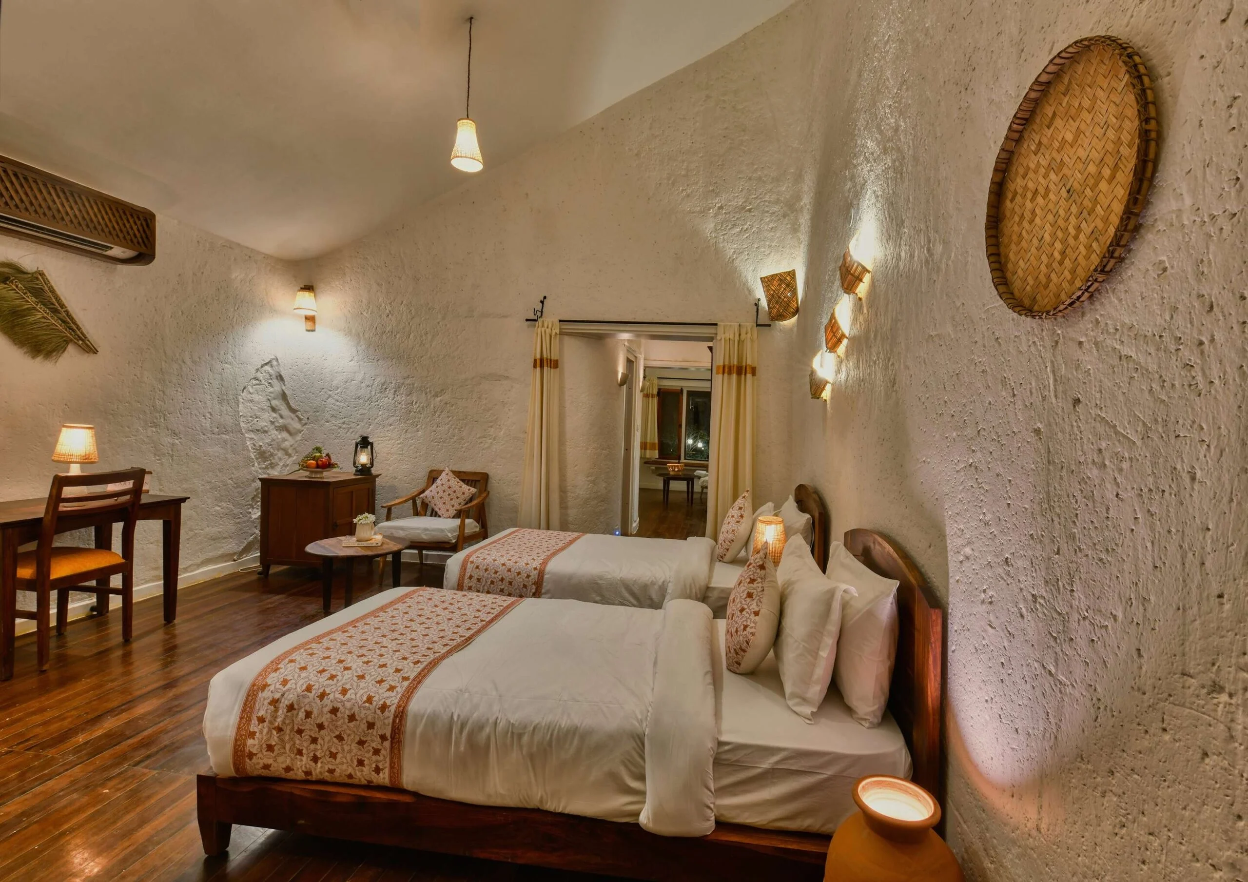 5. Dhara – The Stone and Lime Cottage Dhara blends stone and lime for a rustic yet elegant look. The personal garden offers guests a private space to relax. Inside, the oxide-finished floors and stone walls keep the room cool and comfortable. Dhara is perfect for those seeking solitude and connection with nature.