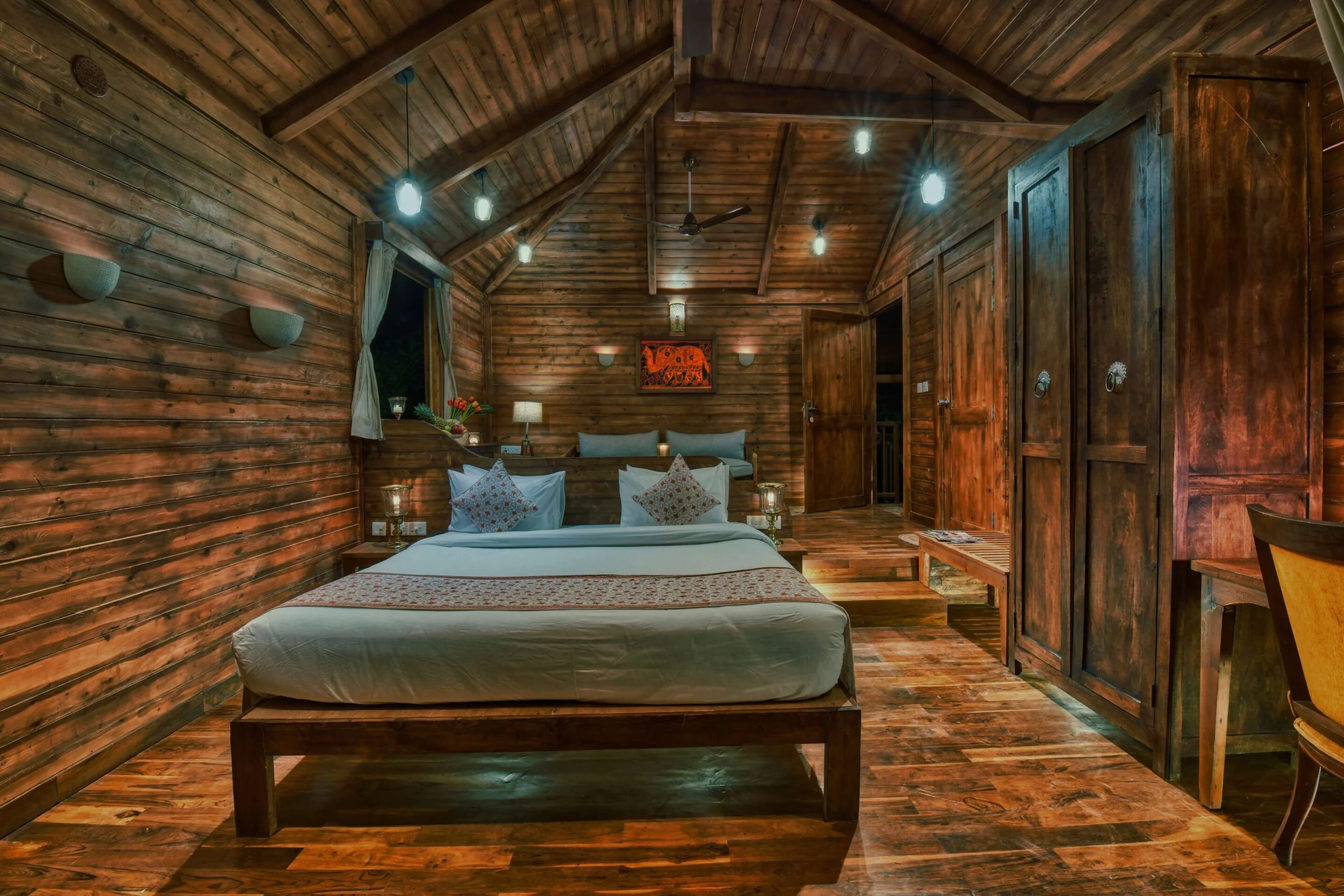 3. Neer – The Romantic Cottage Designed for couples, Neer offers a private indoor pool and a cozy atmosphere. The mud walls and glass accents create a serene space perfect for honeymooners. Couples can relax on their private sit-out and enjoy intimate moments in nature’s beauty.